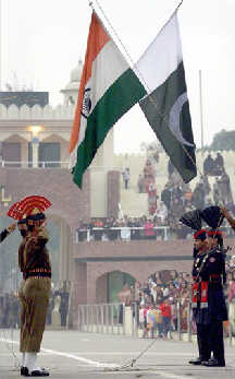2004年1月5日,在印度和巴基斯坦交界的瓦格赫边境检查站,两国士兵在各自举行的降旗仪式中。