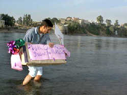 2004年1月7日,在印控克什米尔的查谟市西北30公里靠近印巴实际控制线的杰纳布河上,民间团体“印度青年之声”的一名成员在向河中投放装有糖果的盒子,希望这个盒子能漂到下游的巴基斯坦,把他们支持印巴对话和解的美好愿望带给巴基斯坦人民。