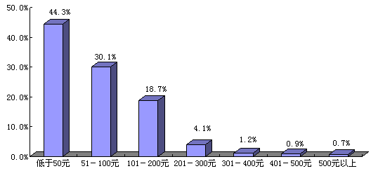 第十次CNNIC调查结果显示,网民每月花费的上网费用主要集中在100元以下,低于50元的网民最多,达到44.3%(如图3-8所示)。总体来讲,网民每月实际花费的上网费用偏低。