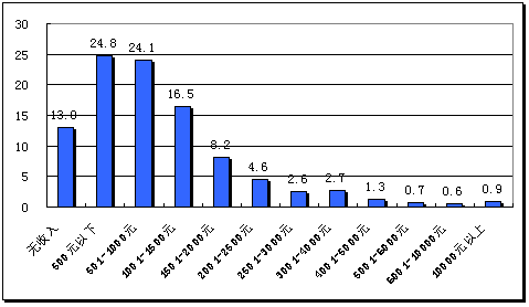 第十次CNNIC调查结果显示,86.6%的网民个人月收入不超过2000元,只有13.4%的网民个人月收入在2000元以上,37.8%的网民个人月收入在500元以下(包括无收入)(如图2-14所示)。低收入网民仍然占据主体。这种结构可能与网民中学生占据一定比例有很大关系。