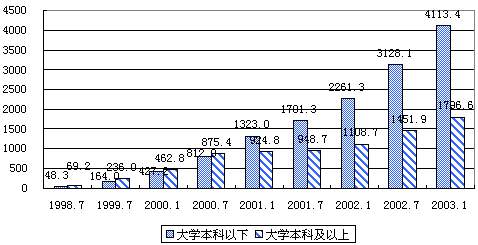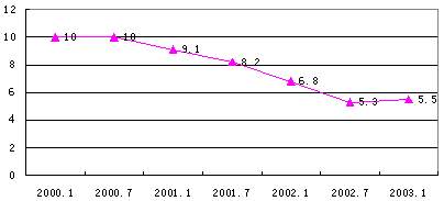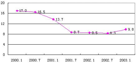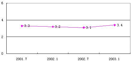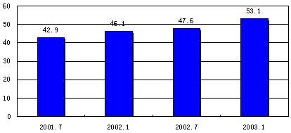 预计2003年互联网产业和传统产业的结合程度、互联网的渗透程度将进一步增强,网民数将达到8630万,增长率为46%(预测数据通过以历次调查数据、资料和其它相关数据为基础建立的组合预测模型计算得到)。