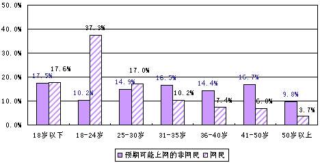 综上所述,没有上网设备、不懂电脑/网络等客观原因是我国非网民没有上网的主要原因,由于个人对互联网的主观看法/印象方面的原因而没上网的非网民只是少数。在预期可能上网的非网民中,男性仍多于女性,且年龄分布较为均衡,已婚的人占多数。可以预计,近期内我国网民中男性网民仍将是上网的主力军;年轻网民仍占多数;已婚网民比例可能有所增长,但未婚网民仍多于已婚网民。