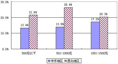 图5-7 华东、西北地区网民每月实际花费的上网费用