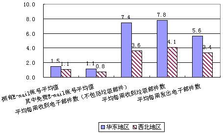 图5-10 华东、西北地区网民拥有E-mail帐号平均值和平均每周收发电子邮件数