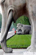 石像生:在十三陵大碑楼至龙凤门的神路两侧。有石兽二十四座(狮、獬、豸、骆驼、象、麒麟、马各四,均二卧二立),石人十二座(武臣、文臣、勋臣各四),为明宣德十年(1435年)整修长陵、献陵时雕造。均用整块巨石琢成。