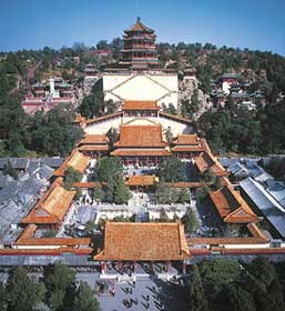 北京颐和园始建于公元1750年,1860年在战火中严重损毁,1886年在原址上重新进行了修缮。其亭台、长廊、殿堂、庙宇和小桥等人工景观与自然山峦和开阔的湖面相互和谐、艺术地融为一体,堪称中国风景园林设计中的杰作。