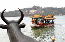 16、铜牛:铜牛在昆明湖东岸,十七孔桥东桥头北侧。1755年用铜铸造,称为“金牛”。铜牛是为镇压水患而设。