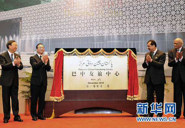 12月18日,国务院总理温家宝在伊斯兰堡与巴基斯坦总理吉拉尼共同出席巴中友谊中心揭牌仪式。 新华社记者 李涛 摄
