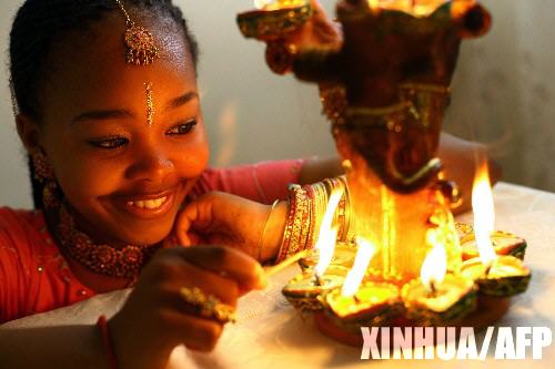 10月21日,在南非的德班,一名女孩点燃蜡烛,庆祝印度教的传统节日排灯节。当天,世界各地信奉印度教的人们庆祝排灯节。新华社/法新