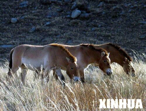 生活在蒙古呼斯泰岭自然保护区野马放养基地的三只普氏野马在吃草(摄于10月23日)。新华社记者郝利锋摄