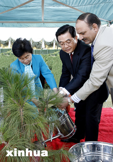 11月24日下午,胡锦涛主席一行驱车来到这个嘉木苍翠的地方。在巴基斯坦内政部长谢尔帕奥和首都发展局主席莱沙里陪同下,胡主席种下一株松苗,并培土、浇水。在杲杲丽日的映衬下,这株新苗显得生机勃勃。公园负责人向胡主席介绍说:“这是巴基斯坦的一种多年生松树,能长得很高。”