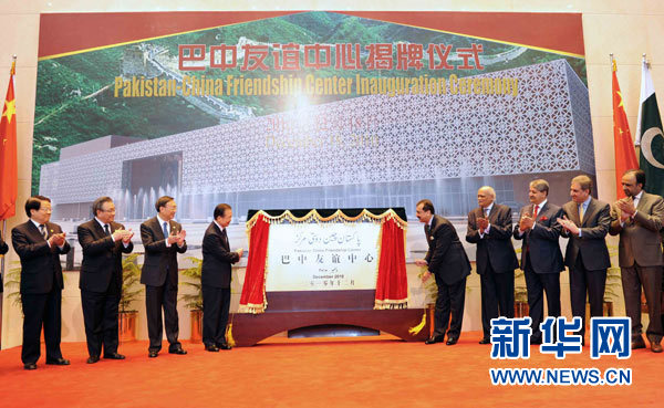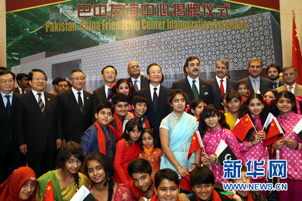12月18日,中国国务院总理温家宝在伊斯兰堡与巴基斯坦总理吉拉尼共同出席巴中友谊中心揭牌仪式。 新华社记者 李涛 摄
