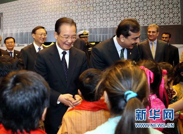 12月18日,出席巴中友谊中心揭牌仪式后,温家宝和巴基斯坦总理吉拉尼与参加活动的孩子们在一起。新华社记者 刘卫兵 摄