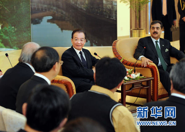 12月18日,国务院总理温家宝与巴基斯坦总理吉拉尼在伊斯兰堡巴中友谊中心共同与为中巴友谊作出贡献的各界友人座谈。 新华社记者 李涛 摄