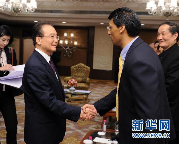 12月17日,中国国务院总理温家宝在印度新德里与中印文化界人士座谈。这是座谈会开始前,温家宝总理同与会人员亲切握手交谈。 新华社记者李涛 摄